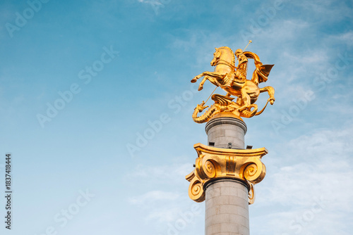 © EdNurg, Naklejka premium 1 November 2025, Tbilisi, Georgia: Golden statue of Saint George on a tall column in the city center, representing victory and freedom