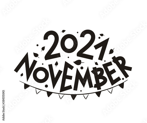 Fototapeta premium November 2021 with hand-drawn autumn leaves and garland. Months logo for the design of calendars, seasons postcards, diaries. Black and white Vector illustration isolated on white background.