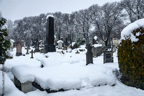 Fototapeta premium Novi Sad, Serbia - January 05, 2026: Catholic Cemetery covered with heavy snow