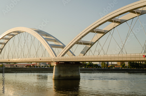 © caocao191, Naklejka premium Novi Sad, Serbia. July - 25. 2022. Zezelj bridge on river Danube in Novi Sad. View of the Zezelje Bridge on the Danube in Novi Sad from the Petrovaradin side in the summer and in the afternoon.
