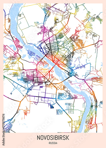 © Towseef Dar, Fototapeta premium Novosibirsk Russia City Map. downtown printable Landmarks print painting, travel art banner modern city, urban city art, background abstract