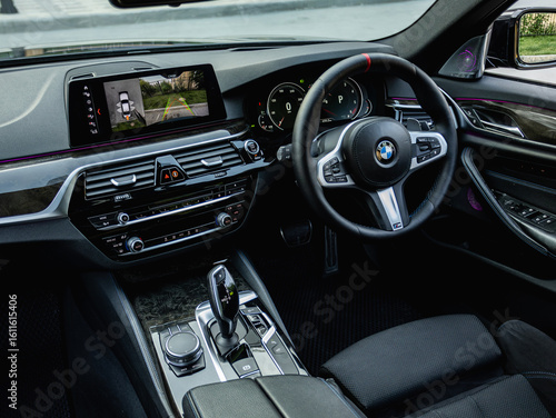 Fototapeta premium Novosibirsk, Russia - July 10, 2024: black BMW 5-series, car Interior -...