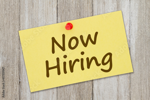 © Karen Roach, Naklejka premium Now hiring message on retro yellow paper index card with pushpin