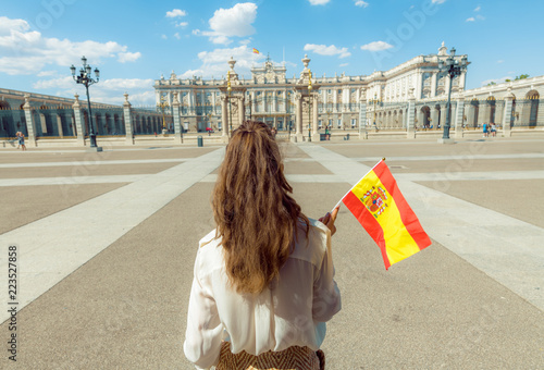 © Alliance, Fototapeta premium nowoczesna podróżniczka z flagą Hiszpanii przeciwko Pałacowi Królewskiemu
