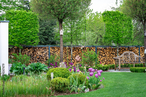 © Beenis, Fototapeta premium Nowoczesny piękny ogród z angielską ławeczką na tle drewnianego ogrodzenia. Dom z nowoczesnym ogrodem . Miejsce do wypoczynku