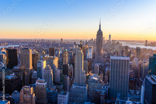 © Simon Dannhauer, Obraz premium Nowy Jork - USA. Zobacz na panoramę centrum Manhattanu ze słynnym Empire State Building i drapacze chmur o zachodzie słońca.
