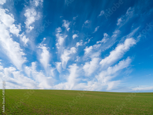 © time and light, Fototapeta premium Nubes rotas en un gran cielo azul sobre un cultivo verde.
