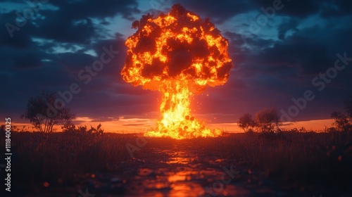 © irawan710, Obraz premium Nuclear explosion mushroom cloud over field at sunset.