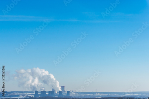 Naklejka premium Nuclear power plant on the sky background. Cooling towers of NPP with smoke.