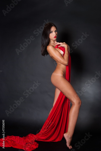 © Domforstock, Naklejka premium Nude body covered with a reb fabric