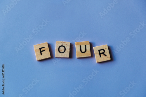 Obraz premium Number four laid out from tiles in words. Wooden tiles on a blue background...