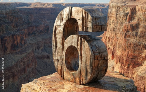 Fototapeta premium Number 6 made of layered sedimentary rock, placed on a cliffside overlooking a deep canyon