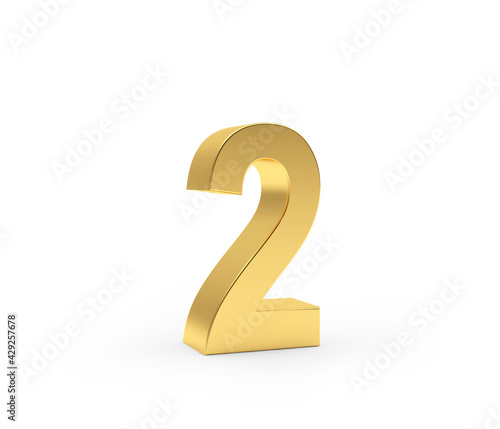 © ravital, Fototapeta premium Number two is made of gold metal on a white background. 3d illustration