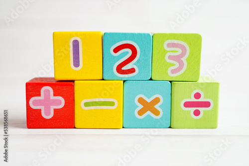 Obraz premium Number wood block cubes for learning Mathematic, education math concept.
