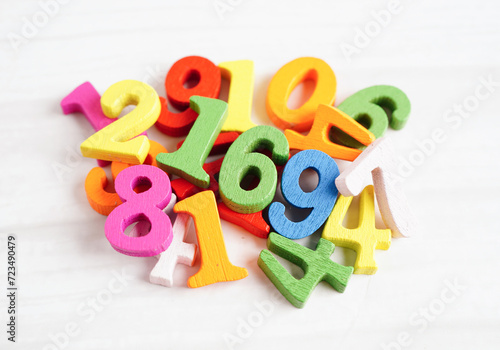 Naklejka premium Number wood block cubes for learning Mathematic, education math concept.