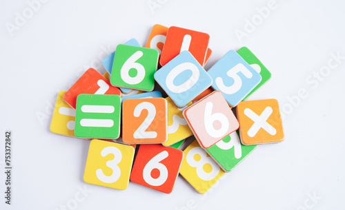 Fototapeta premium Number wood block cubes for learning Mathematic, education math concept.