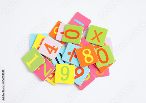 © manassanant, Naklejka premium Number wood block cubes for learning Mathematic, education math concept.