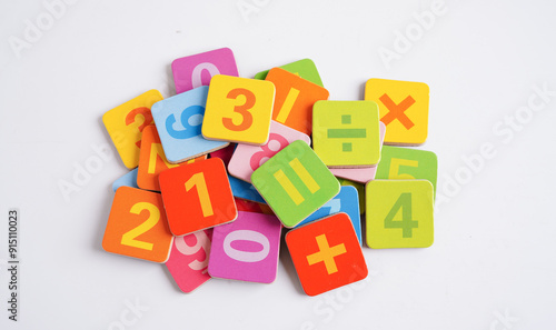 © manassanant, Obraz premium Number wood block cubes for learning Mathematic, education math concept.