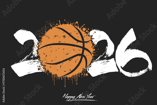 © mityay_pg, Obraz premium Numbers 2026 and a abstract basketball ball made of blots in grunge style. Design text logo Happy New Year 2026. Template for greeting card, banner, poster. Vector illustration on isolated background