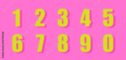© Liliya, Fototapeta premium Numbers with blurred edges, fluted glass style. Pixel numbers. Set of bright yellow blurred numbers on pink background. Vector set