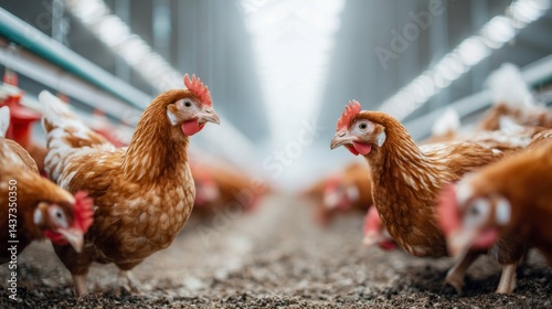 Fototapeta premium Numerous chickens gathered in a modern henhouse, presenting a scene of...