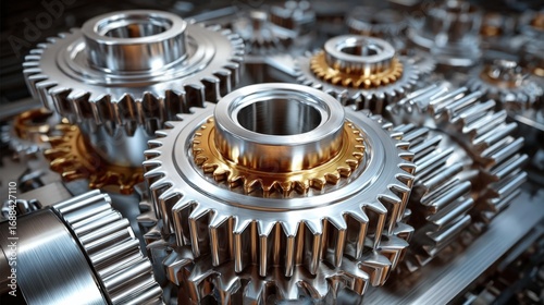 Fototapeta premium Numerous metallic gears interlocked and arranged in a precise manner...