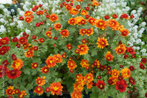 Naklejka premium Numerous red and yellow flowers of semidouble Chrysanthemums in mid October