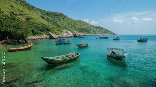 © Yopi, Fototapeta premium Numerous Small Boats In Clear Turquoise Water Near Lush Green Hillside