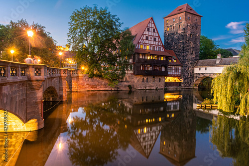 © Stefano Zaccaria, Naklejka premium NUREMBERG, GERMANY, 27 JULY 2020: A colourful and picturesque view of the half-timbered old houses on the banks of the Pegnitz river in Nuremberg at night