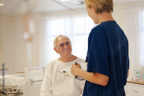 © KOTO, Fototapeta premium Nurse and older patient talking in hospital room