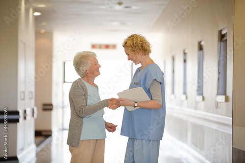 Fototapeta premium Nurse and senior patient shaking hands in hospital corridor