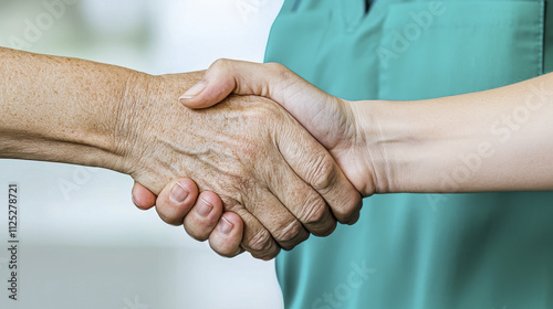 Fototapeta premium Nurse and senior patient shaking hands, symbolizing care and trust. This moment reflects compassion and connection in healthcare settings