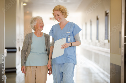 © KOTO, Obraz premium Nurse and senior patient talking in hospital corridor
