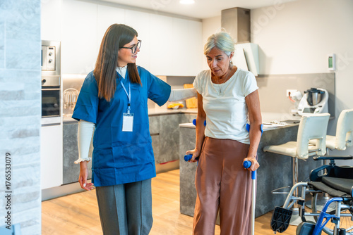 © unai, Fototapeta premium Nurse assisting senior woman with crutches for rehabilitation