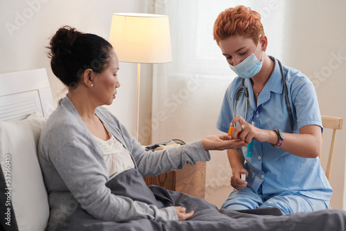 © DragonImages, Obraz premium Nurse giving pill for sick patient