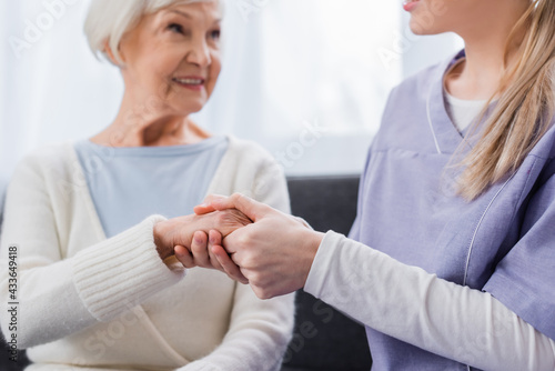 Fototapeta premium nurse holding hand of aged woman smiling on blurred background