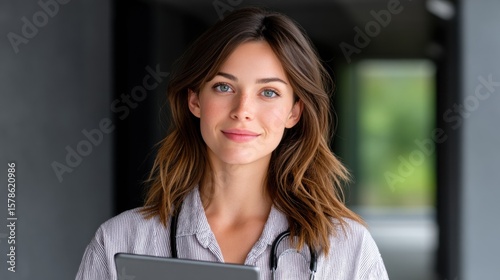 Fototapeta premium Nurse Holding Tablet in Modern Healthcare Environment with Focus on Electronic Medical Access