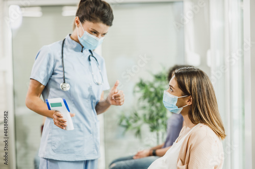 Fototapeta premium Nurse Measuring Temperature In Waiting Room