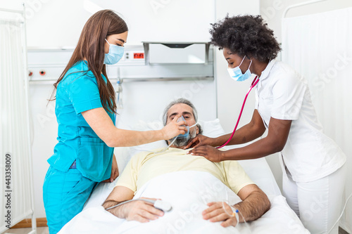 Obraz premium Nurse puts oxygen mask on elderly man patient lying in the hospital room bed while African American doctor examining patient with stethoscope, coronavirus covid 19 protection concept
