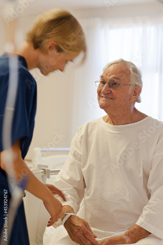 © KOTO, Fototapeta premium Nurse reading older patient's medical bracelet in hospital