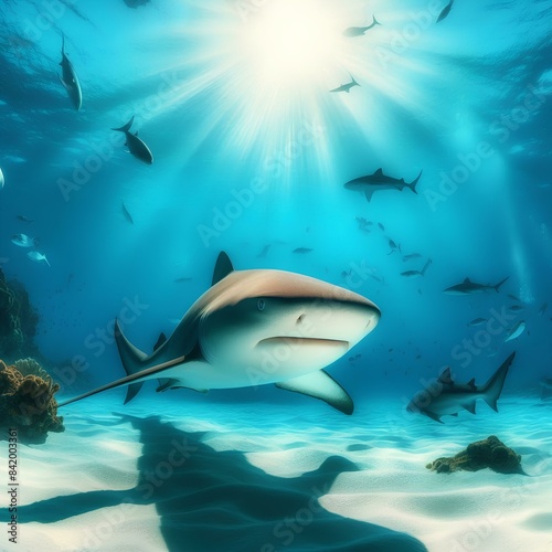 © Lab, Fototapeta premium Nurse shark swims in tropical blue sea with sunny light. Swimming with shark