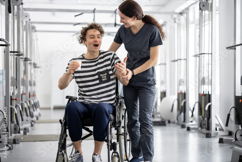 Obraz premium Nurse walking with happy guy in wheelchair at rehabilitation center. Concept...