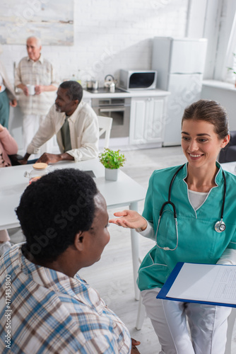 Fototapeta premium Nurse with clipboard talking to african american patient in nursing home