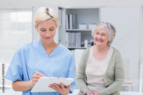 Obraz premium Nurse writing on clipboard while patient sitting in clinic