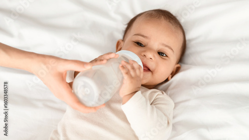 © Prostock-studio, Obraz premium Nursery And Childcare Concept. Portrait of cute little black kid drinking milk, mother holding baby bottle in hands, feeding her child who lying on white blanket on the bed in the bedroom at home