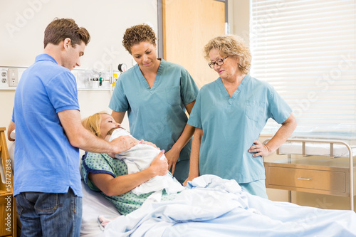 © Tyler Olson, Fototapeta premium Nurses And Man Looking At Newborn Baby Sleeping On Mother