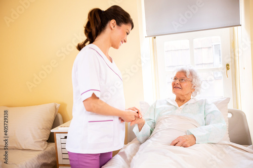Obraz premium Nursing home doctor holding a hand of a senior woman patient occupant while she is lying