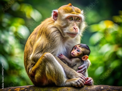 © Danicha, Fototapeta premium Nurturing Moment: Monkey Foster Mom Caring for Adorable Baby Monkey in a Natural Habitat Setting