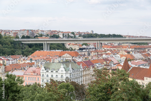 Obraz premium Nusle Bridge, Prague, Czech Republic – 24.07.2024. A cityscape with red-roofed buildings and a modern bridge over. Greenery surrounds the historic and contemporary architecture