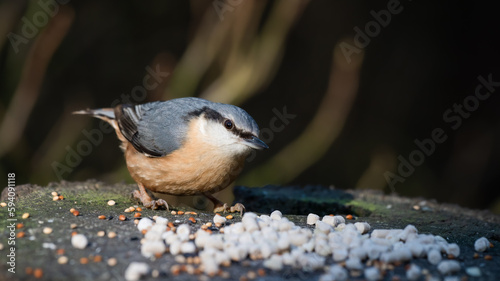© Ian, Fototapeta premium Nuthatch Feeding on an Old Tree Stump